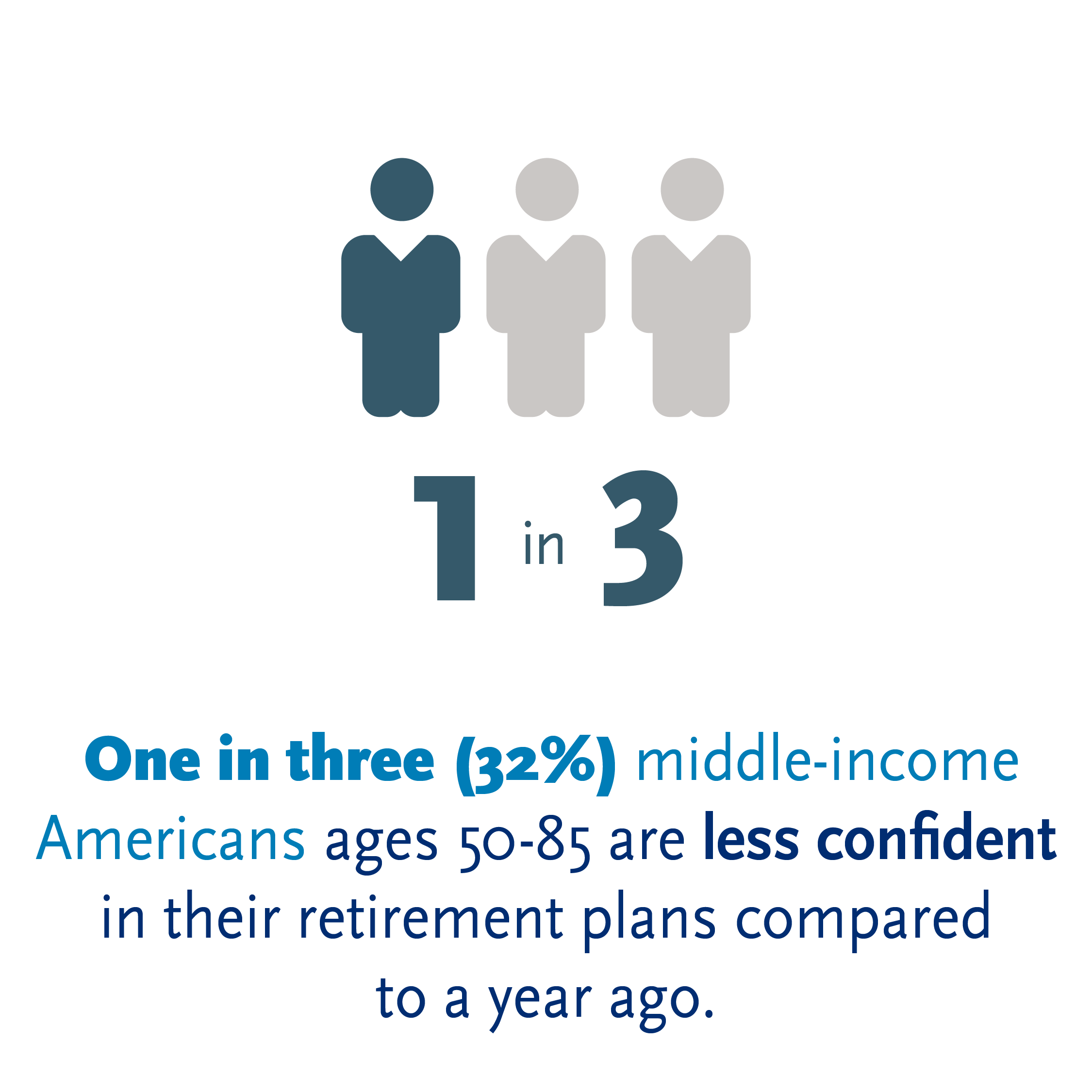 One in three (34%) middle-income Americans ages 50 to 85 feel less confident in meeting their daily financial obligations such as rent/mortgage, utilities and groceries, including half (48%) of those with under $50,000 in investible assets. Our findings suggest that many are reassessing how their current resources can support their longterm financial plans.