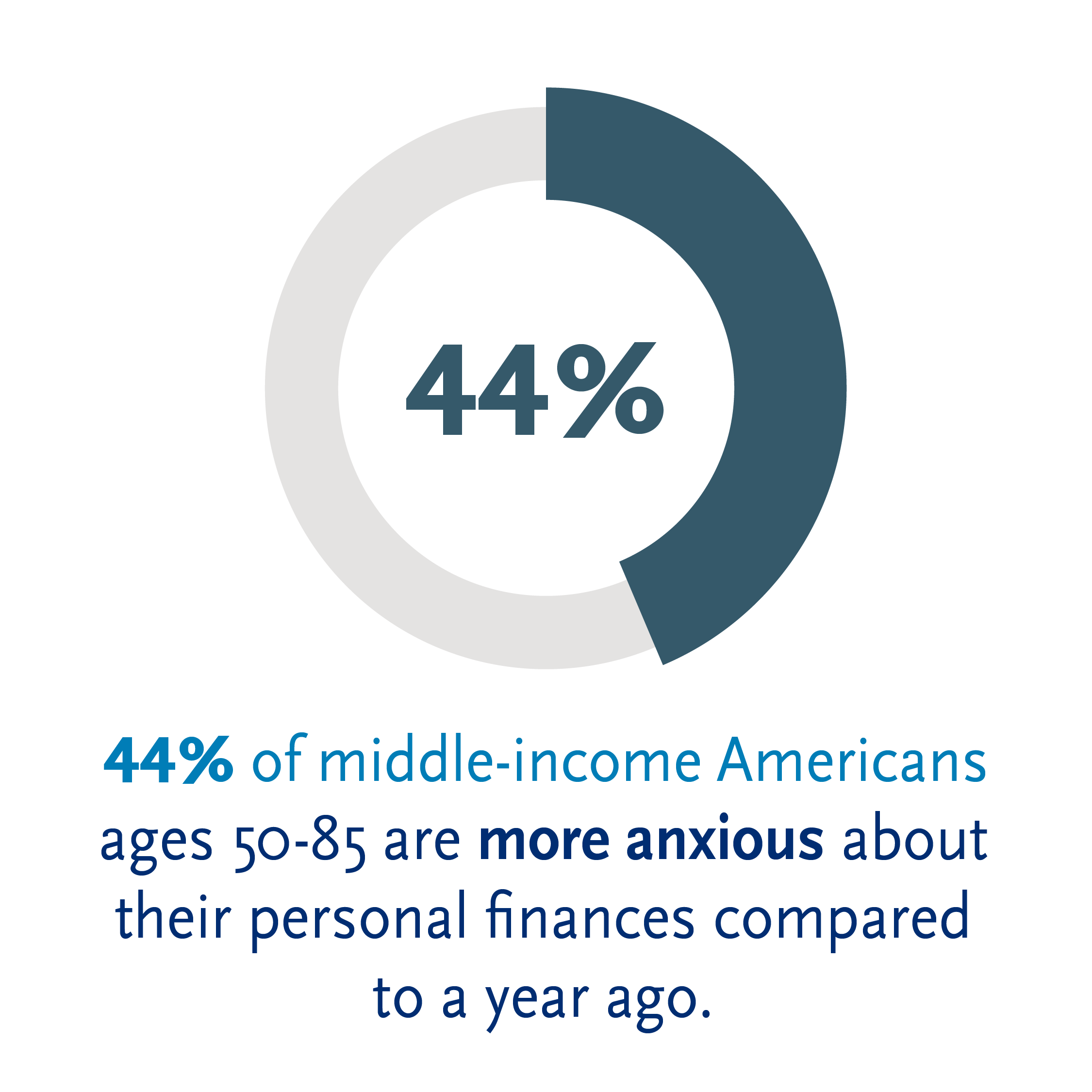 Inflation and uncertainty about longterm financial stability are contributing to rising anxiety, leaving middle-income Americans concerned about their financial future. Our survey reveals that the top concerns about retirement among middle-income Americans ages 50 to 85 are inflation (27%), outliving their money (23%) and cuts to Social Security benefits (18%).