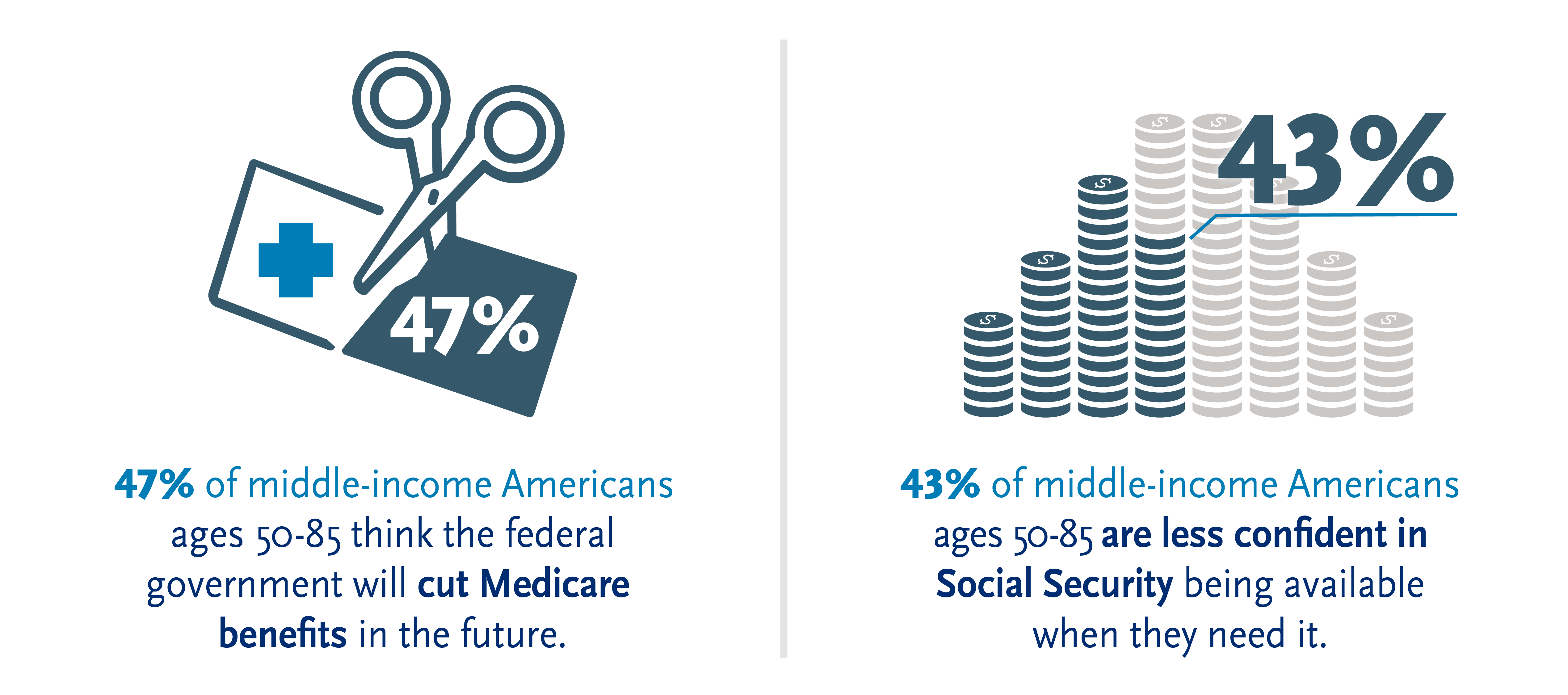 Trust in key federal safety nets is also waning, with 43% of middle-income Americans ages 50 to 85 less confident that Social Security will be available when they need it—while nearly half (47%) believe Medicare benefits will be cut in the future. Pre-retirees were three times more likely than retirees to be much less confident in the availability of Social Security (19% vs. 7%) and Medicare (18% vs. 6%).